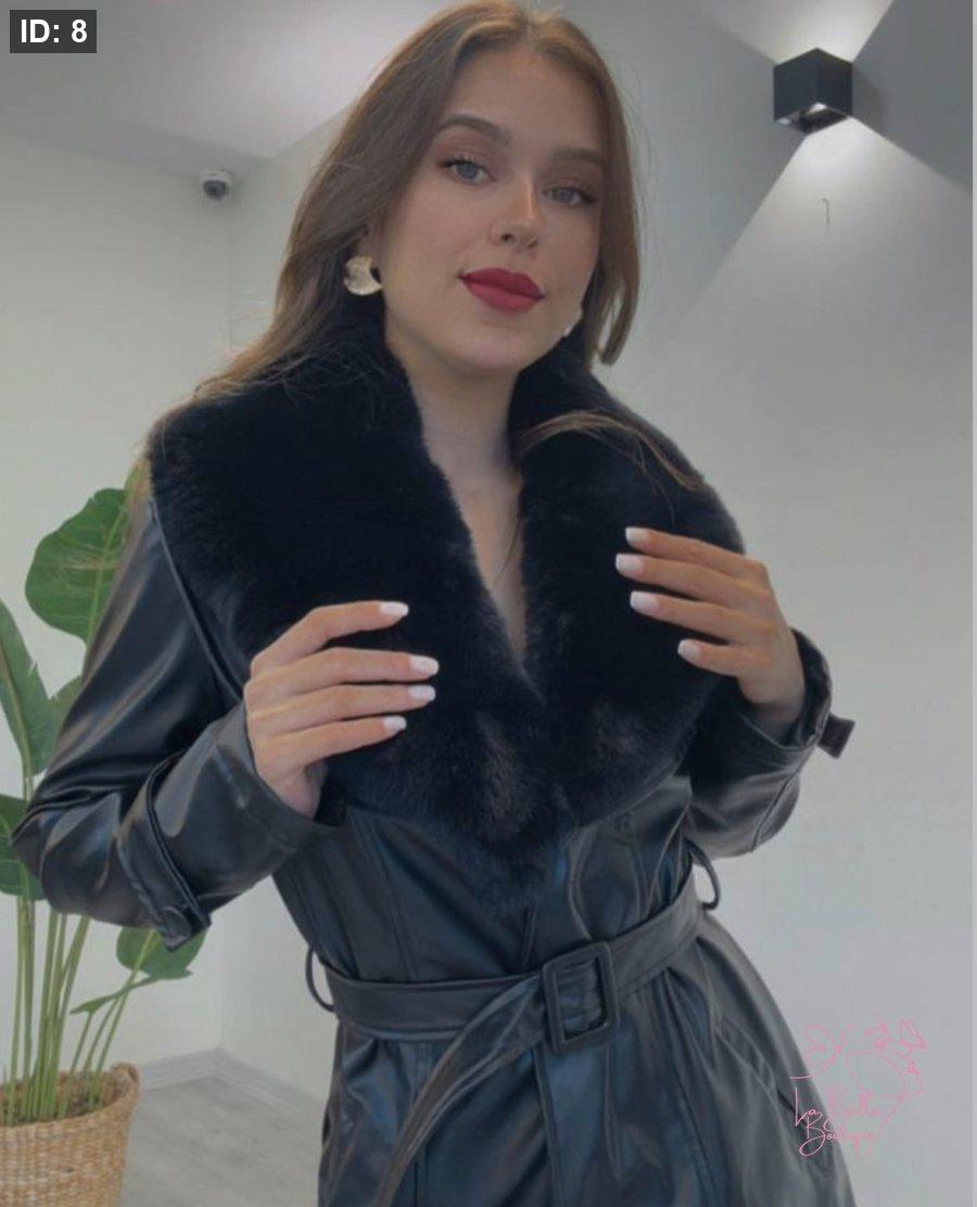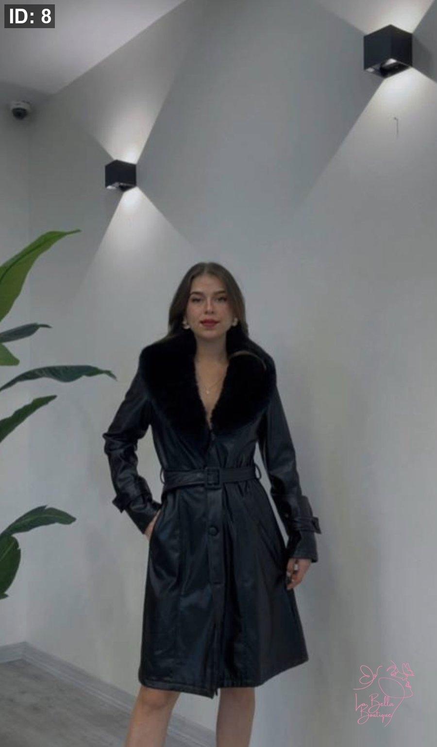 جاكيت جلد اسود طول وسط مع فروة